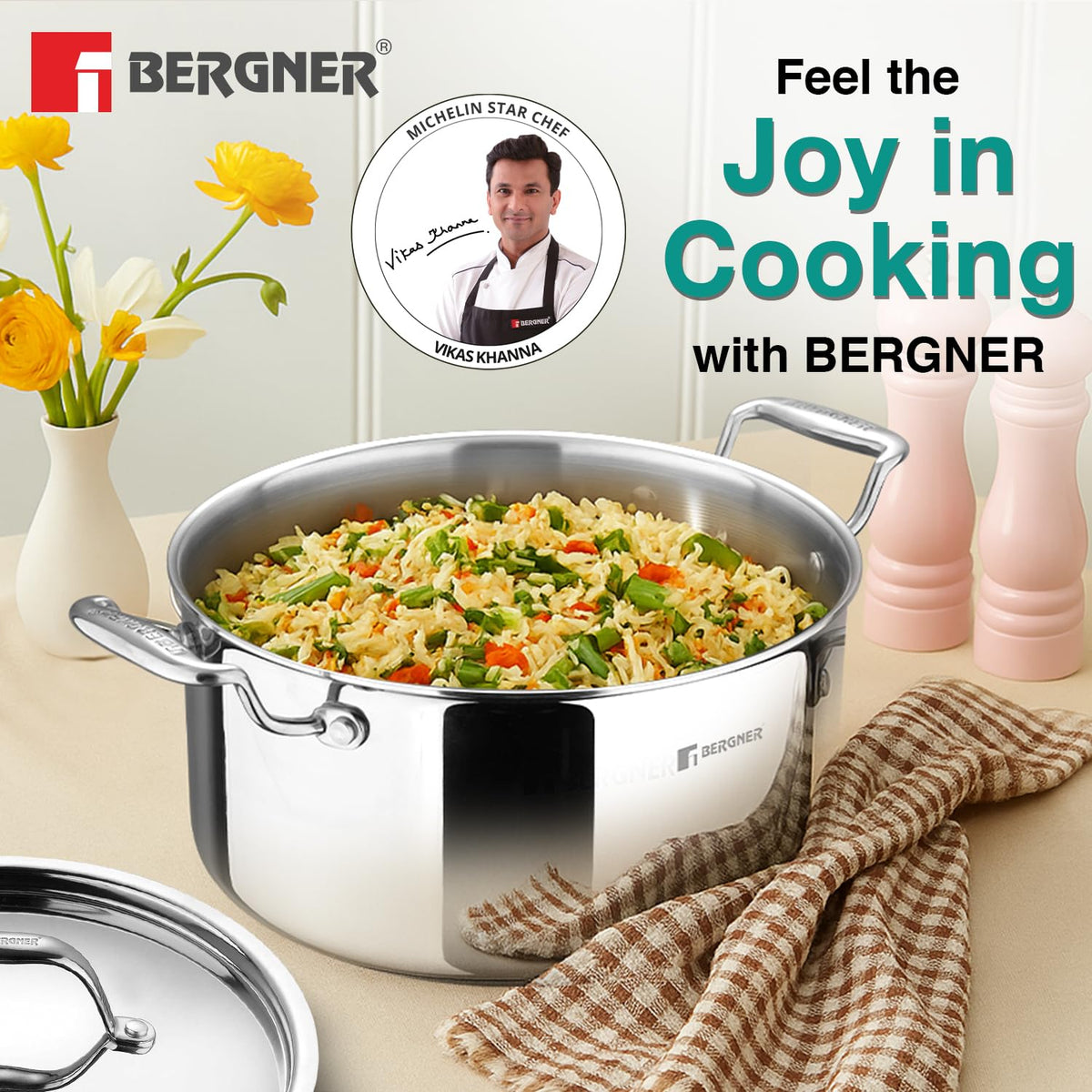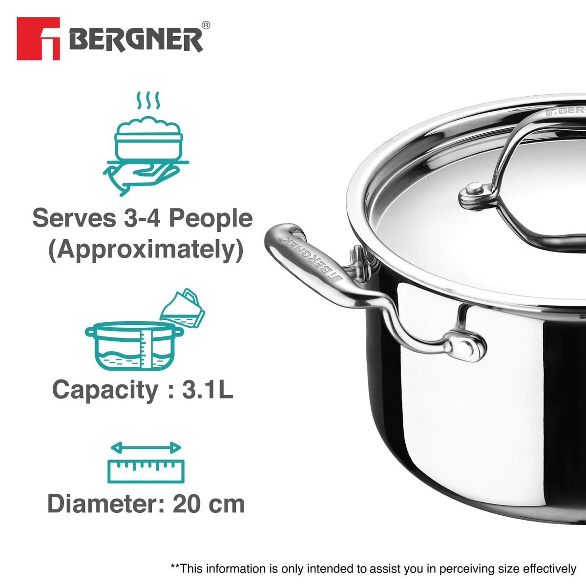 Bergner Argent TriPly Stainless Steel Casserole with Stainless Steel Lid, Stay Cool Cast Handle, Less Oil Use, Healthy Cooking, Food Safe, Durable - Induction and Gas Ready - 3.1L/20 Cm