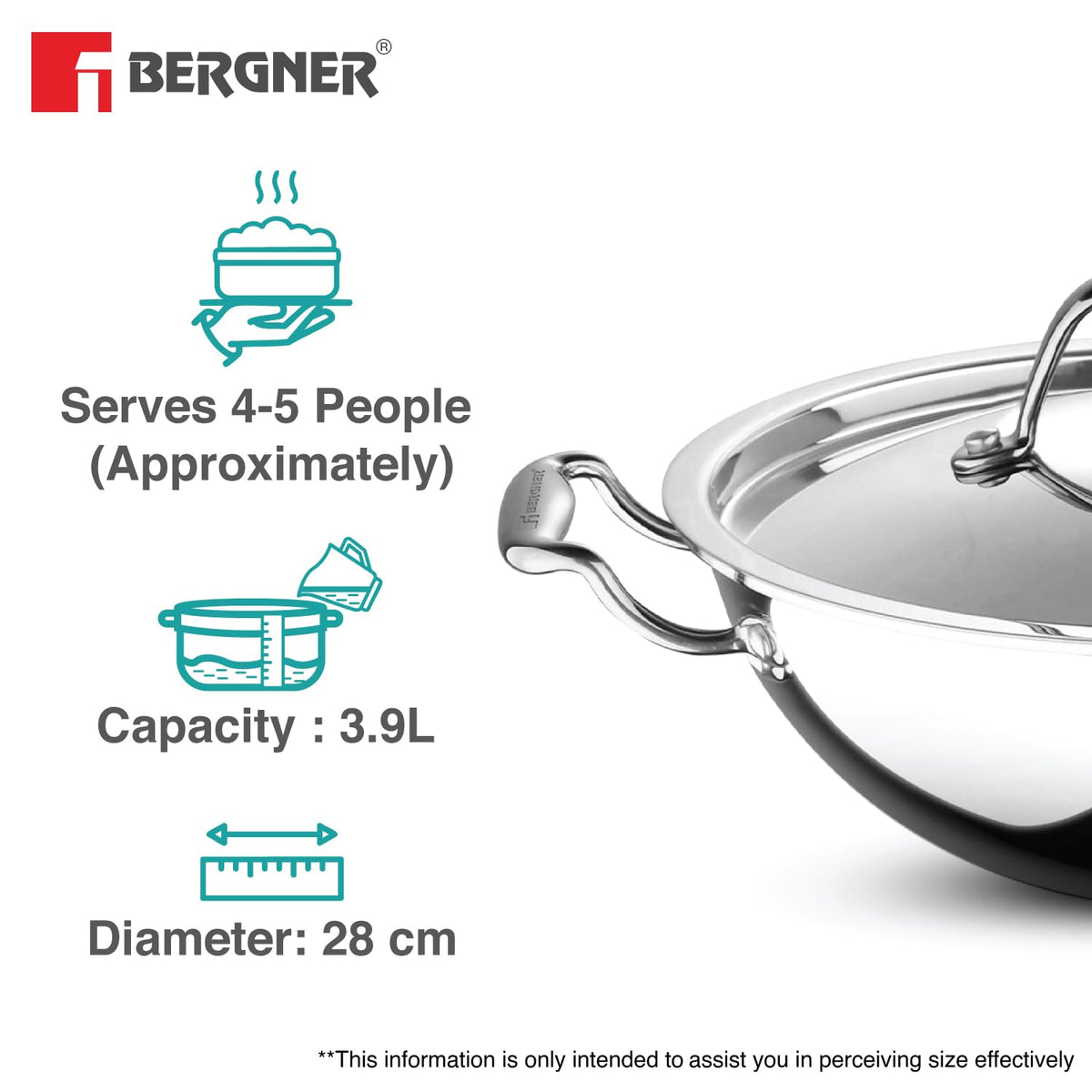 BERGNER Argent TriPly Stainless Steel Kadai with Stainless Steel Lid, Less Oil Use, Healthy Cooking, Food Safe, Stay Cool Cast Handles - Induction and Gas Stove Ready - 1.5 L/ 20 Cm