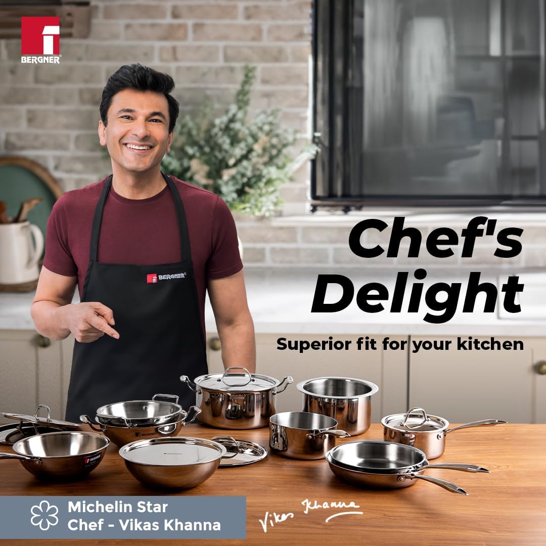 BERGNER Argent TriPly Stainless Steel Sautepan with Stainless Steel Lid, Sturdy Stay Cool Cast Handle, Healthy Cooking, Less Oil Use, Food Safe, Durable - Induction and Gas Stove Ready - 22 CM