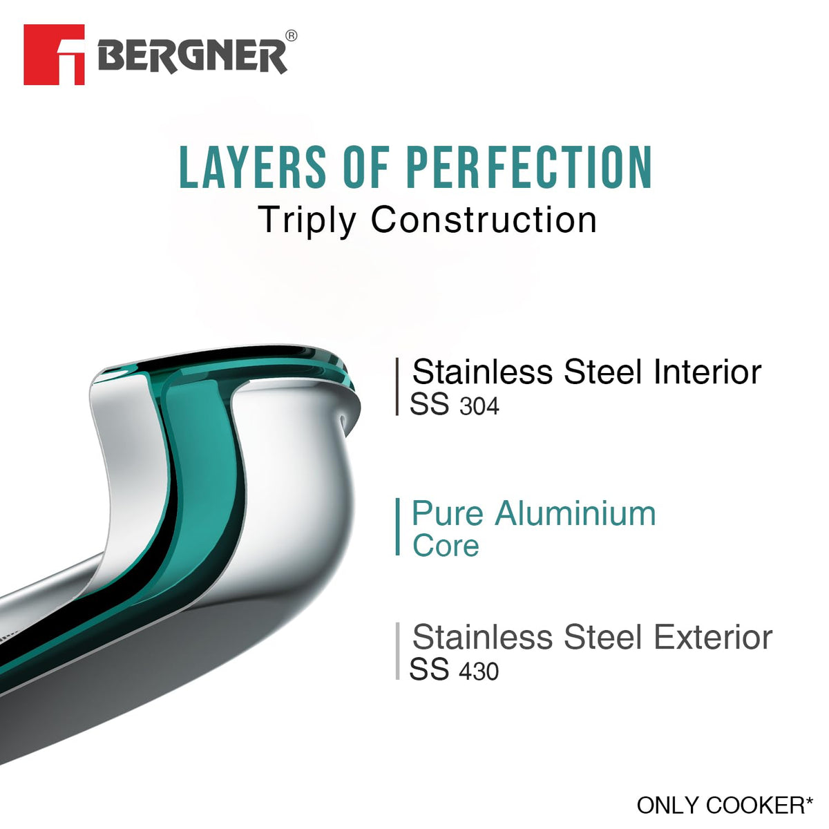 Bergner Trimax Triply Stainless Steel Outer Lid Pressure Cooker, Triply Bottom, For Healthy Cooking, Mirror Finish, Easy To Clean, Durable, Induction Base & Gas Ready, Silver, 5-Year