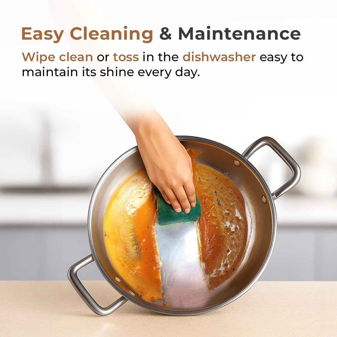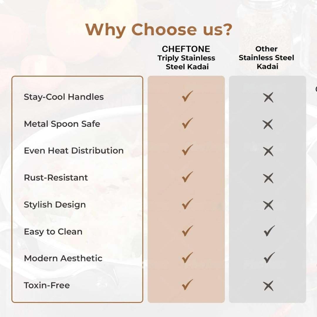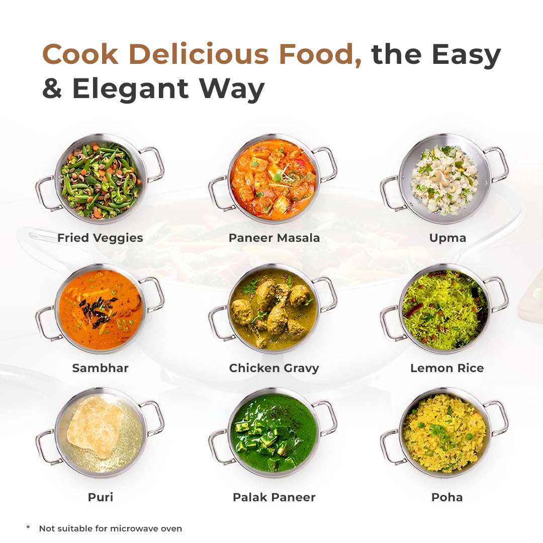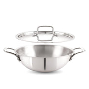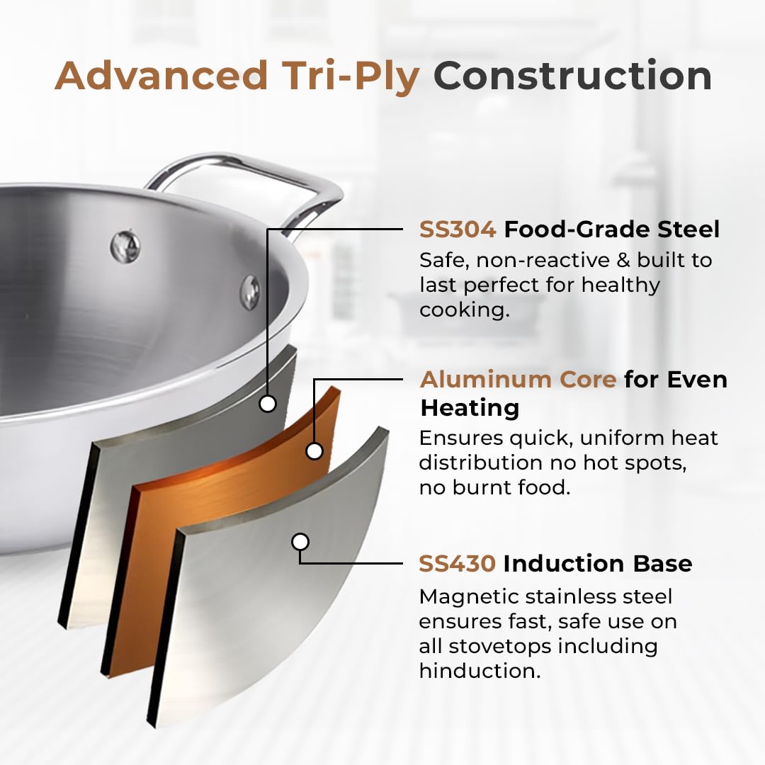 Cheftone Premium Triply Stainless Steel Kadai with Lid | Round Bottom Cookware | 3 Layer Stainless Steel Cookware| Even Heating Compatible with Induction & Gas Stoves - 16 cm
